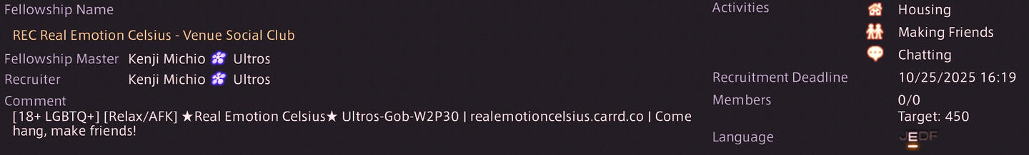 Greeter and Vibe LizardI've been playing FFXIV since Patch 6.4. I usually main as a spoony BRD, but will also play as SMN, SAM and sometimes VPR. I also RP in-game, between lite and immersive style. When not playing FFXIV, I'm usually playing other video games, listening to music, watching the latest Internet oddities on YouTube, or trying my very best to go out and touch grass. I am also a bit of a derp, so please be patient with me!REC has made a huge impact in my life, both in-game and in my personal life. I've reconnected with old friends and made new ones, something that I am truly thankful for. Being a part of this community is the highlight of my time here.Fun Fact